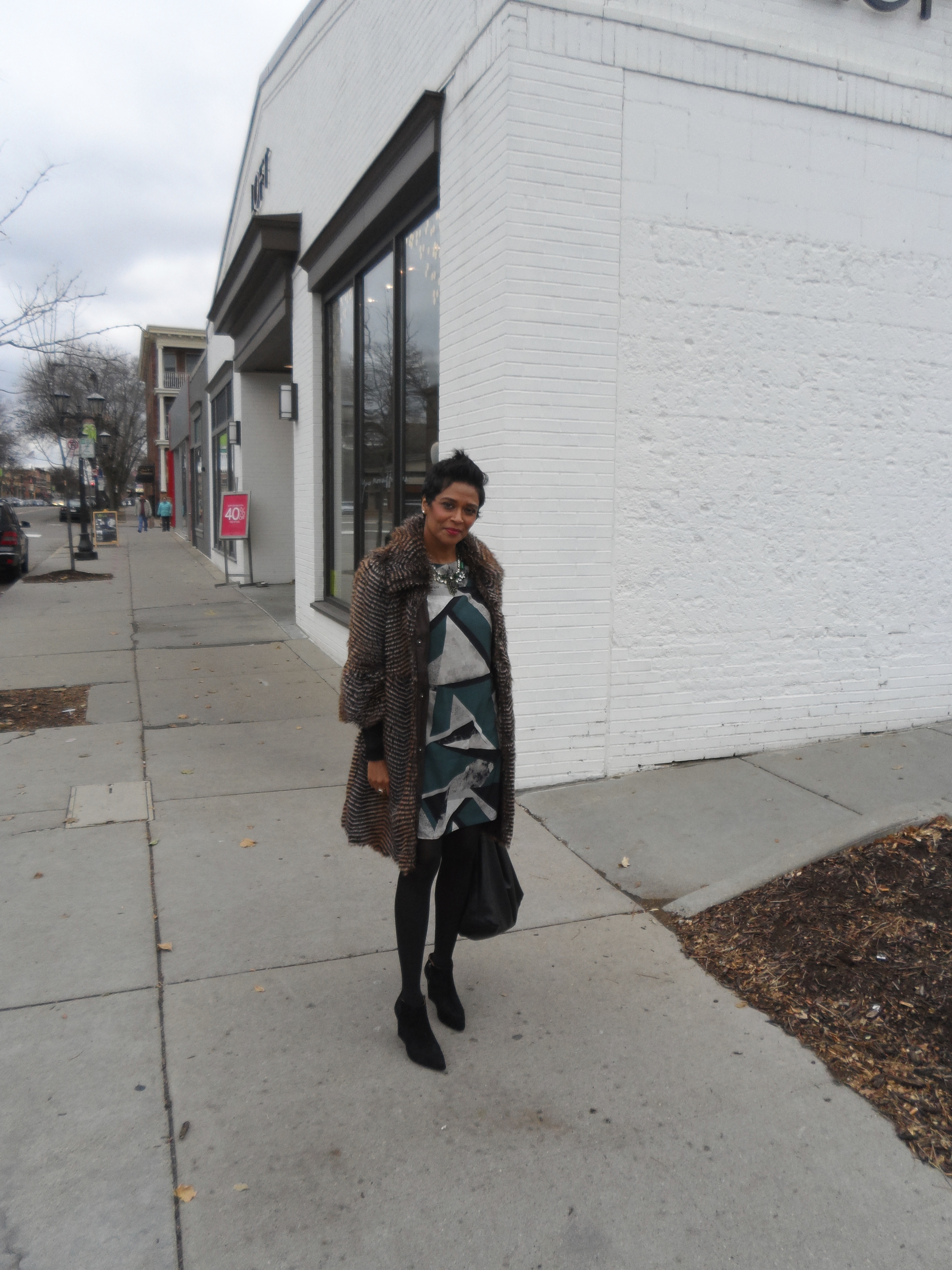 Even though, a small would have been a better fit, (I chose a medium), it was still well fitted and fun to wear. I paired it with black tights, Zara ankle booties and a faux fur coat, purchased from Nordstrom several years ago, and which I absolutely LOVE!!!