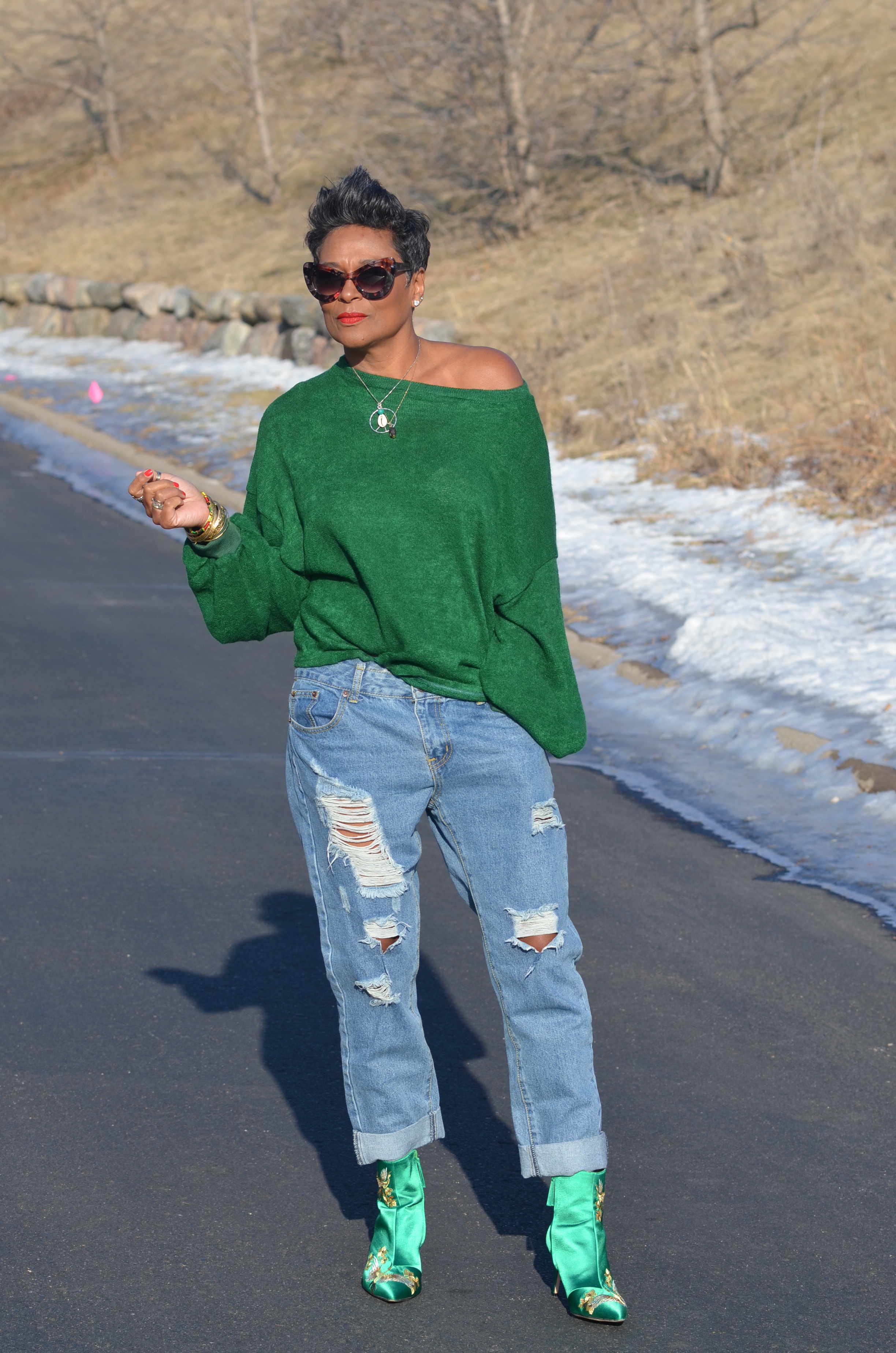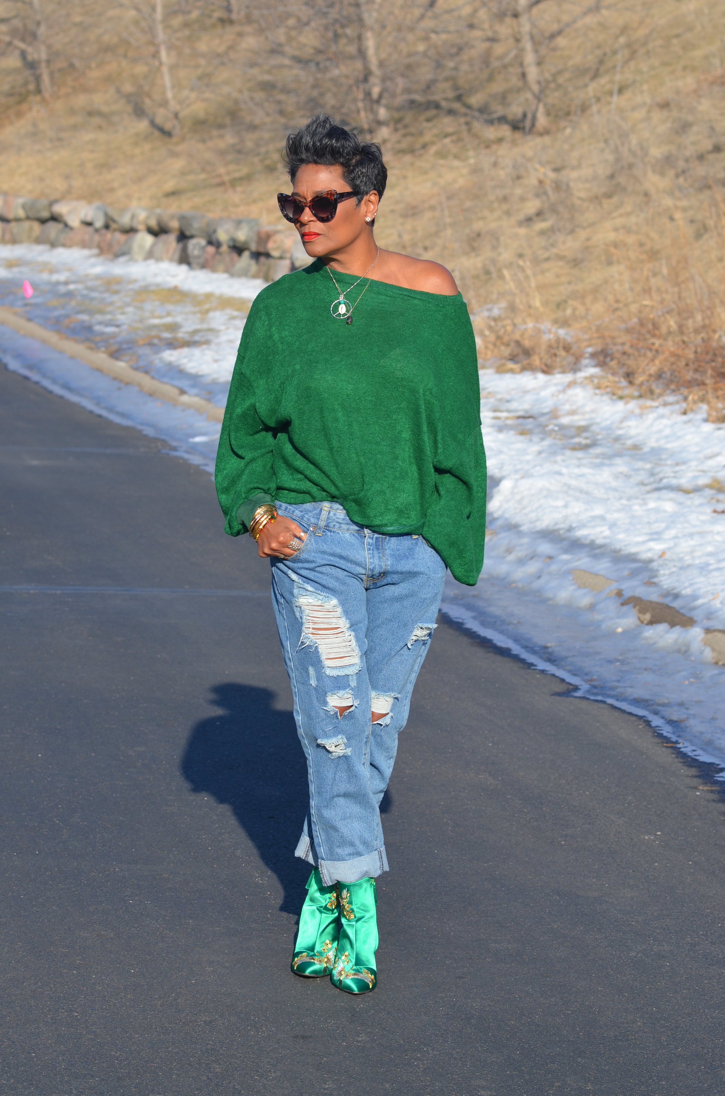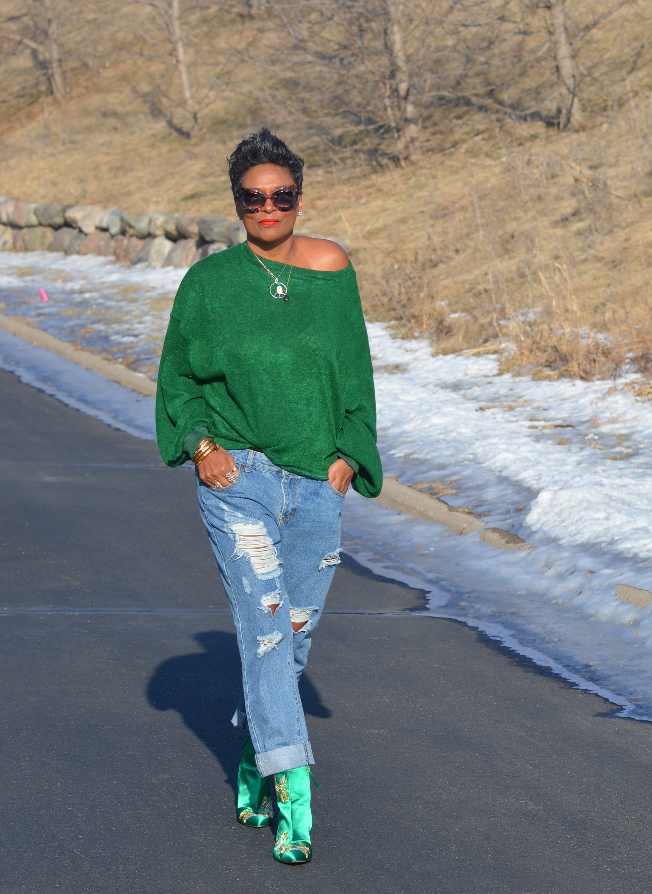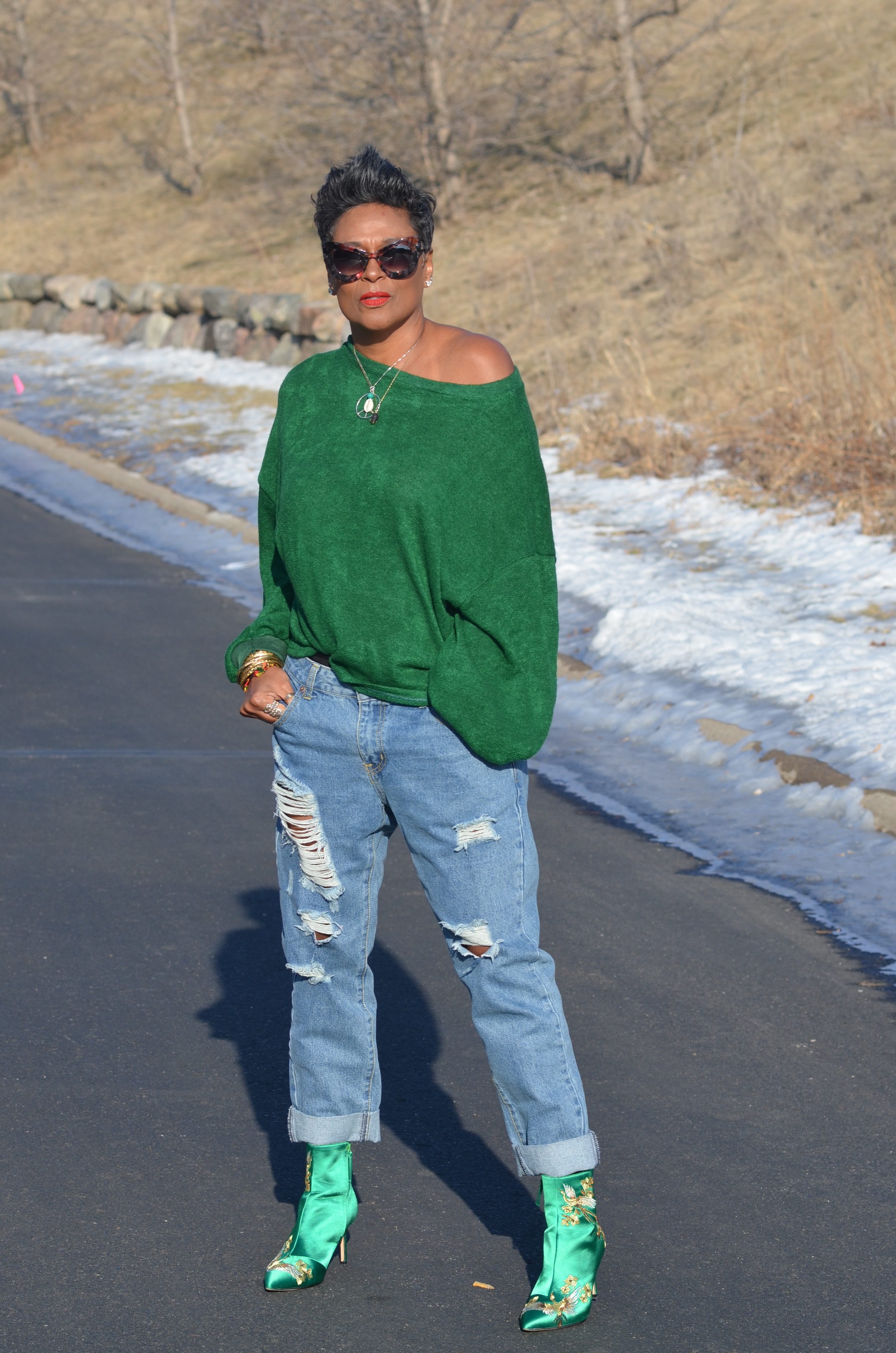 I wanted something similar to the color of my boots and this top, came close enough. I sized up, so I could style it off the shoulders. Great sweater for a perfect, cool day.